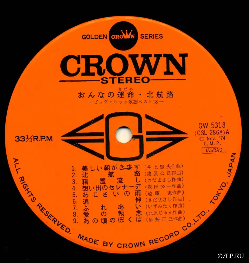 - Издатель и дата: Пластинка выпущена лейблом Nippon Crown в рамках серии Golden Crown Series. Каталожный номер: GW-5313. Копирайт на задней обложке и яблоках диска гласит «© Nov. '74», что указывает на релиз в ноябре 1974 года. Стоимость диска составляла 1,800 иен.