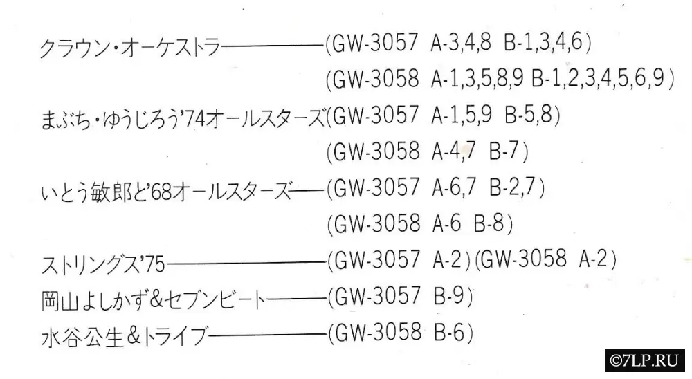 - ストリングス ’75 (Strings '75) — струнный ансамбль (треки GW-3057 A-2 и GW-3058 A-2).