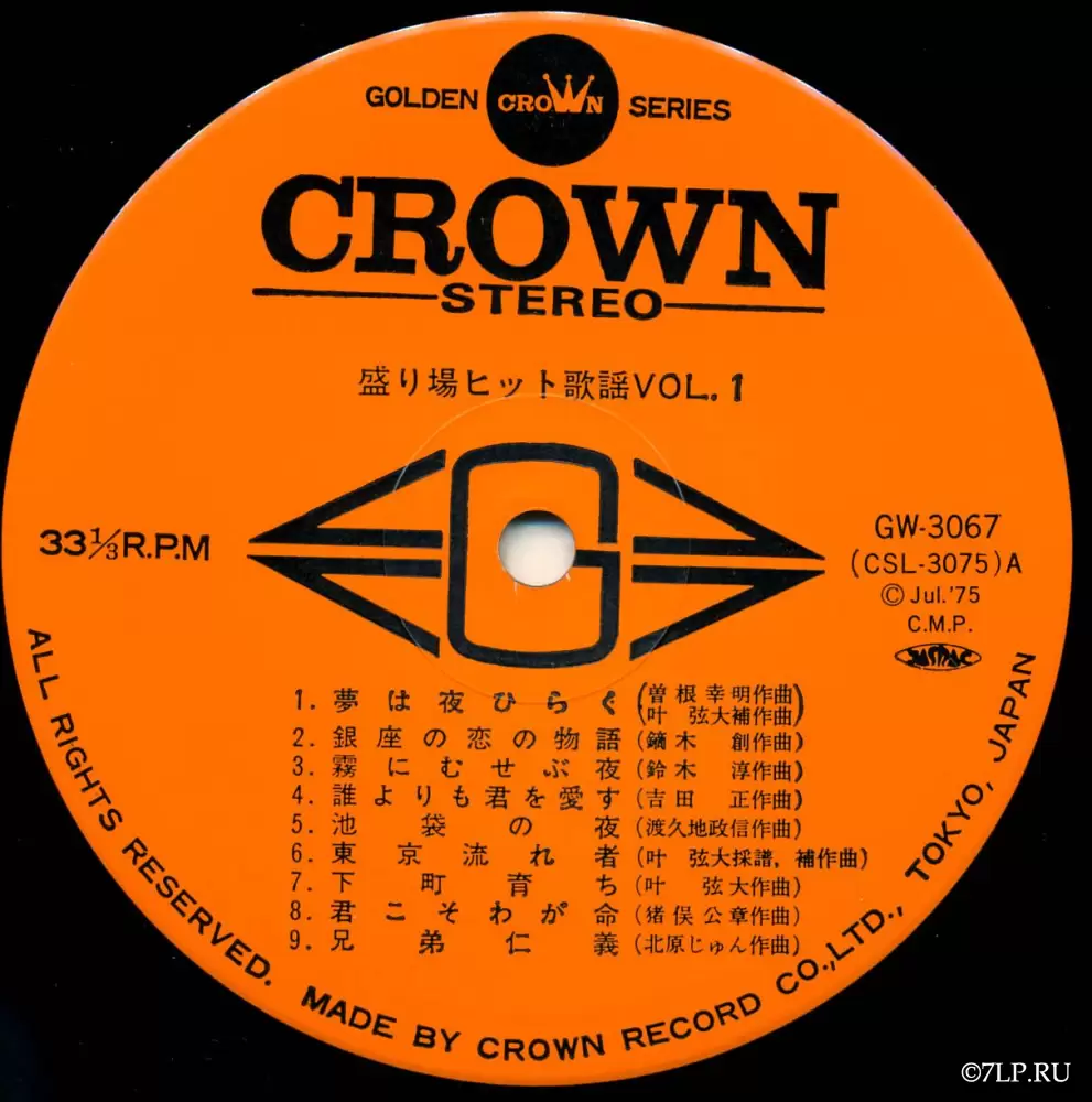 В отличие от поп-релизов, на яблоках этих пластинок указаны только имена композиторов (например, Комей Сонэ, Дзюн Судзуки и др.). Исполнителем же традиционно выступает безымянный студийный оркестр лейбла, скорее всего — Crown Orchestra (クラウン・オーケストラ) или аналогичный ансамбль. Музыкальное сопровождение таких релизов отличается густым, «ночным» звучанием: солирующий тенор-саксофон (имитирующий плачущий мужской вокал), труба, меланхоличная электрогитара и легкий свинг в ритм-секции. Это идеальный саундтрек для фильмов нуар или классического кино про якудза.