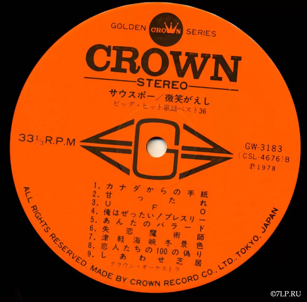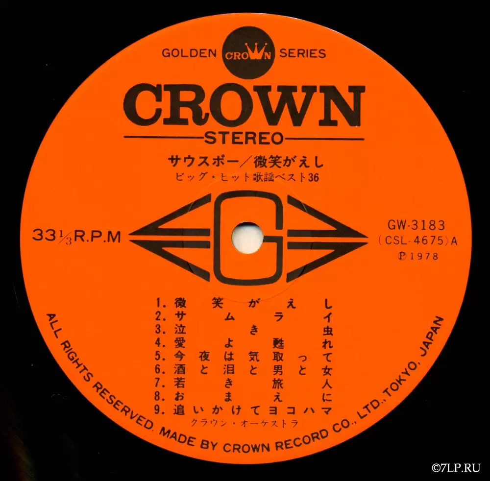 Перед нами двойной виниловый альбом «Big Hit Melodies Best 36» (яп. ビッグ・ヒット歌謡ベスト36), выпущенный японским лейблом Crown Record Co., Ltd. в 1978 году. Альбом вышел в рамках серии Golden Crown Series (каталожные номера GW-3183 и GW-3184).