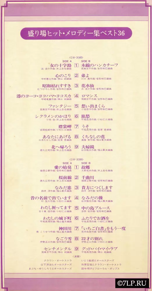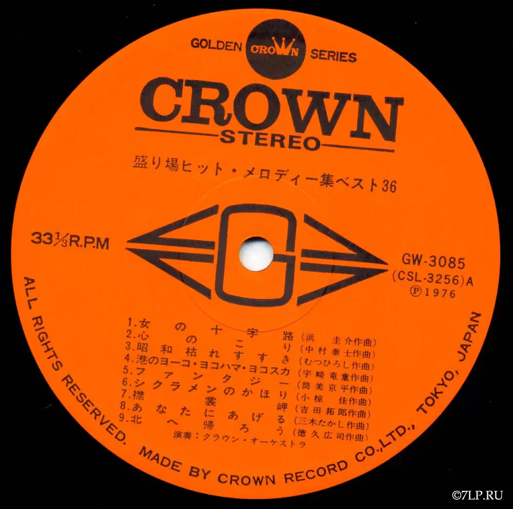 Перед нами двойной виниловый альбом «Sakariba Hit Melody Collection Best 36» (яп. 盛り場ヒット・メロディー集 ベスト36), выпущенный японским лейблом Crown Record Co., Ltd. в 1976 году (каталожные номера GW-3085 и GW-3086). Альбом издан в рамках знаменитой аудиофильской серии Golden Crown Series.
