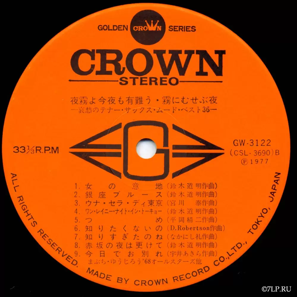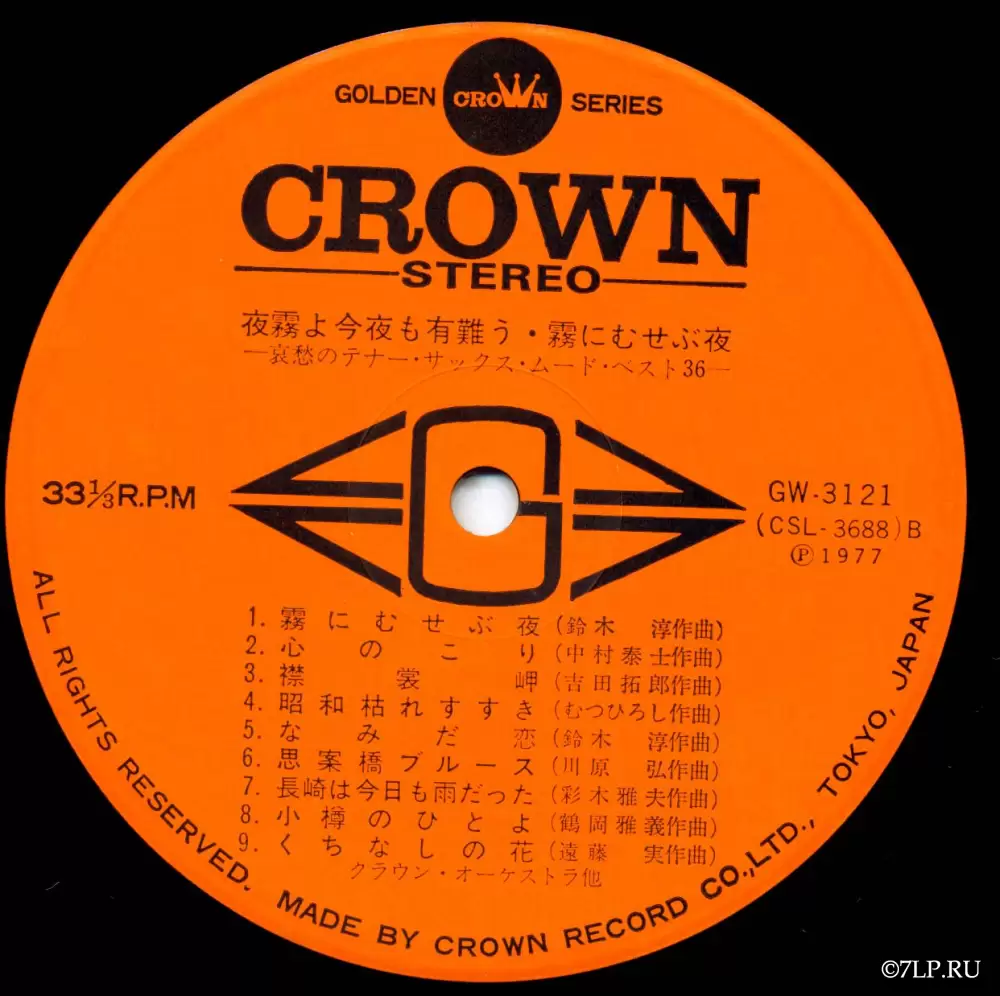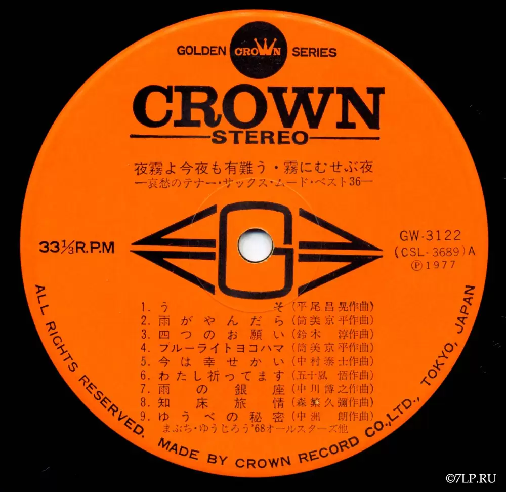 Перед нами двойной виниловый альбом «Yogiri yo Konya mo Arigatou / Kiri ni Musebu Yoru — Aishuu no Tenor Sax Mood Best 36» (яп. 哀愁のテナー・サックス・ムード・ベスト36), выпущенный японским лейблом Crown Record Co., Ltd. в 1977 году (каталожные номера GW-3121 и GW-3122). Альбом вышел в престижной аудиофильской серии Golden Crown Series.