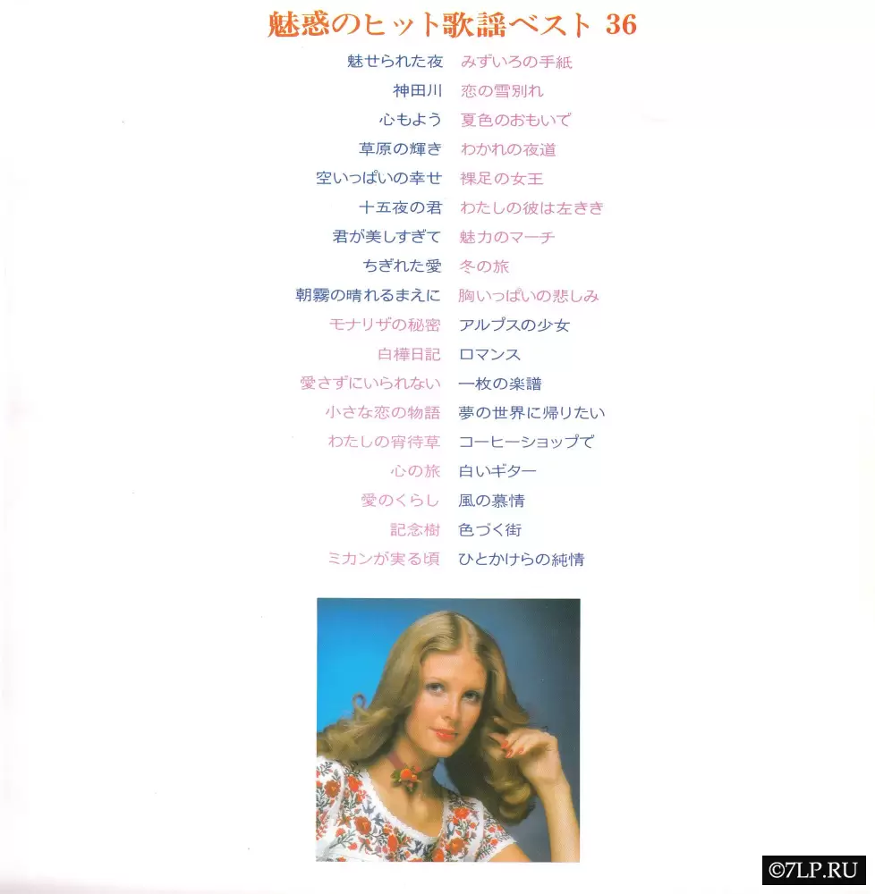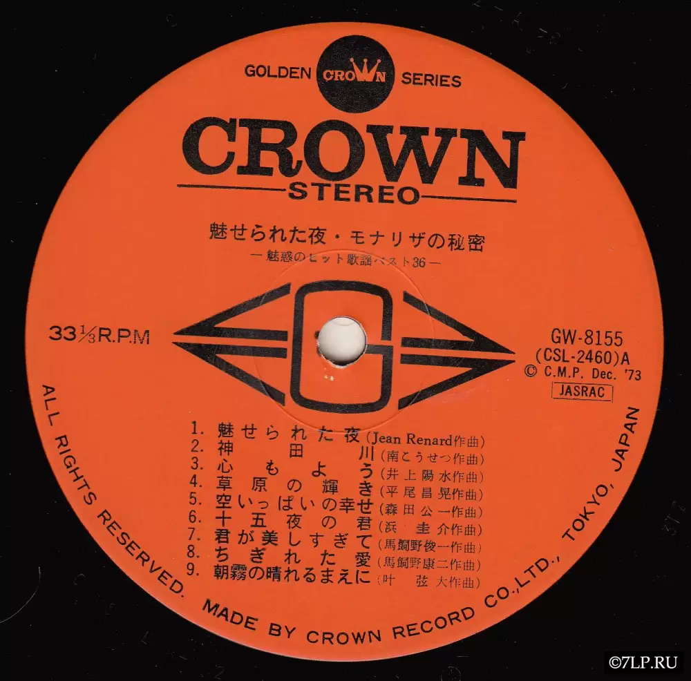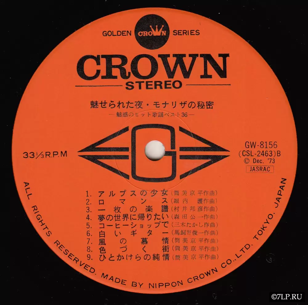 Перед нами двойной виниловый альбом «Miserareta Yoru / Mona Lisa no Himitsu — Miwaku no Hit Kayou Best 36» (яп. 魅せられた夜・モナリザの秘密 魅惑のヒット歌謡ベスト36), выпущенный японским лейблом Crown Record Co., Ltd. в декабре 1973 года (каталожные номера GW-8155 и GW-8156). Альбом издан в рамках престижной серии Golden Crown Series.