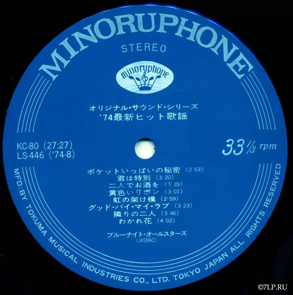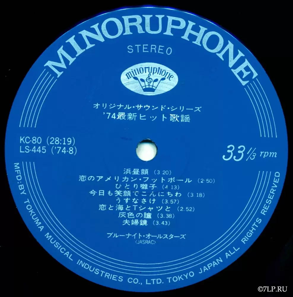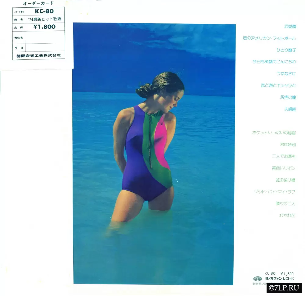 Перед нами полноформатный виниловый альбом «'74 Saishin Hit Kayo» (яп. '74最新ヒット歌謡 — «Новейшие эстрадные хиты 1974 года»), выпущенный японским лейблом Minoruphone Records (подразделение компании Tokuma Musical Industries Co., Ltd.) в августе 1974 года (судя по производственному коду '74-8 на лейблах). Каталожный номер: KC-80.