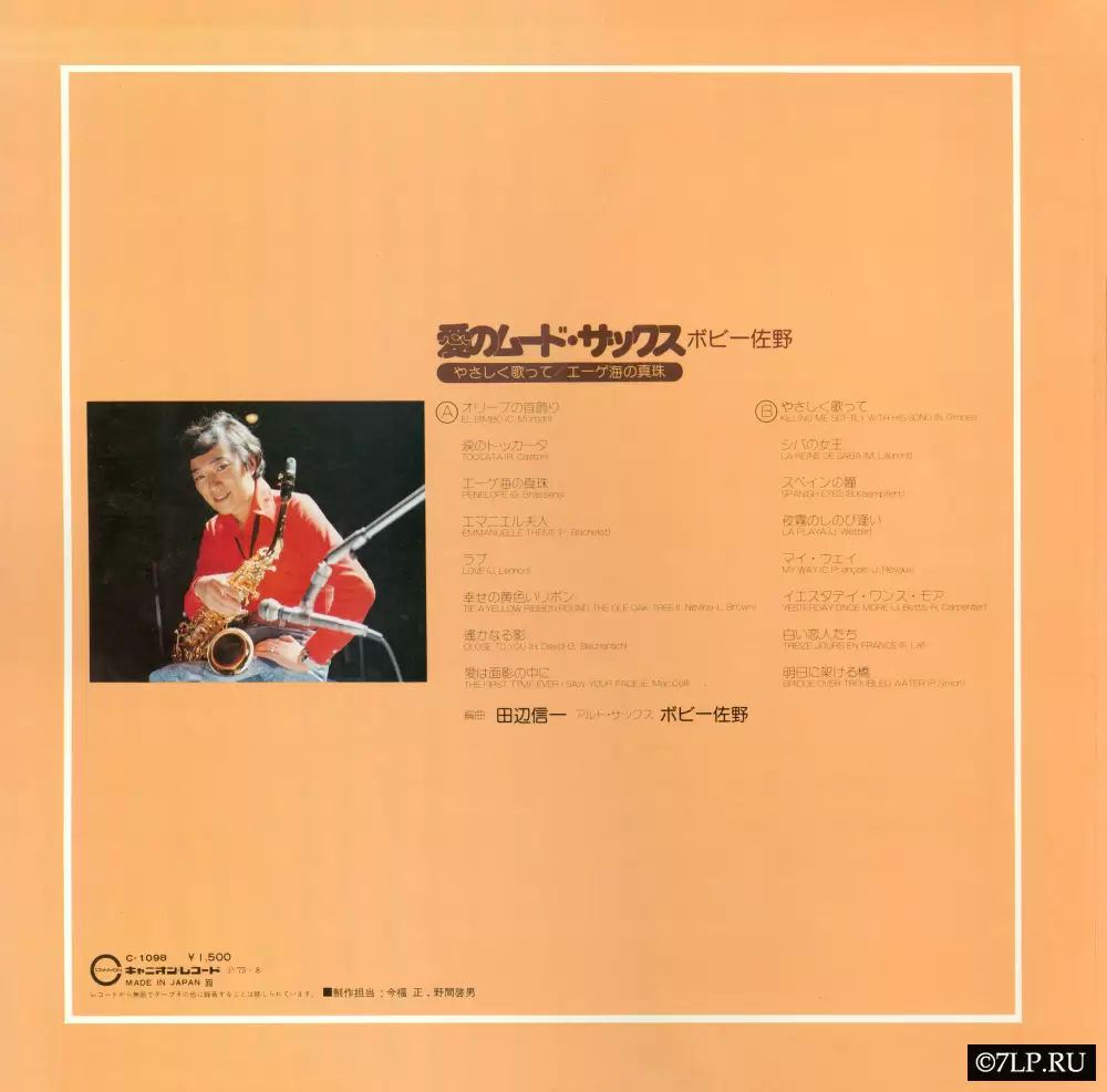 - Аранжировки: На задней обложке указано имя аранжировщика: 田辺信一 (Синъити Танабэ). Это очень известный японский композитор, создававший музыку для кино (например, для культового фильма «Клан Инугами»). Его участие гарантирует, что за саксофоном звучит богатый, кинематографичный эстрадно-симфонический оркестр.