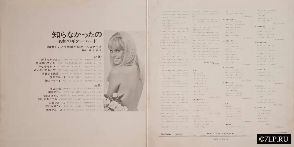 - Оформление: Дизайн выдержан в классическом для Японии конца 60-х стиле cheesecake (легкая эротика). На обложке и задней стороне изображена западная модель с обнаженной спиной и желтыми розами. Такой маркетинг был стандартом для жанра: пластинки покупали взрослые мужчины (саларимэны) для отдыха после работы.