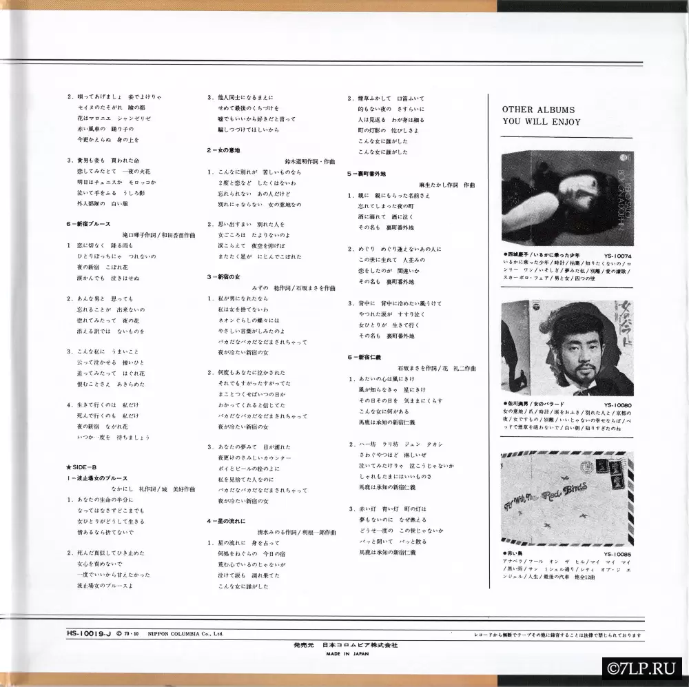 Оригинальная Сторона B (Side B): 7. (1) Блюз женщины с пирса (Hatoba Onna no Blues / 波止場女のブルース) — Pier Woman's Blues [2:53] 8. (2) Женская гордость (Onna no Iji / 女の意地) — Woman's Pride [2:42] 9. (3) Женщина из Синдзюку (Shinjuku no Onna / 新宿の女) — Woman of Shinjuku [3:13] 10. (4) В потоке звезд (Hoshi no Nagare ni / 星の流れに) — In the Flow of the Stars [2:30] 11. (5) Задворки без адреса (Uramachi Bangaichi / 裏町番外地) — Backstreet No Man's Land [2:51] 12. (6) Честь Синдзюку (Shinjuku Jingi / 新宿仁義) — Shinjuku Justice (Honor) [3:03]