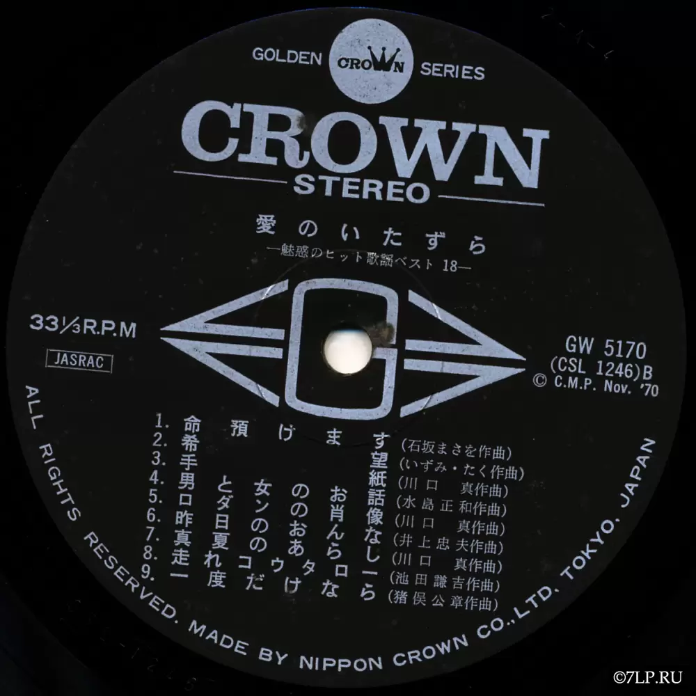 Перед нами классический образец японской музыкальной индустрии начала 1970-х годов — виниловая пластинка, выпущенная лейблом Crown Records.