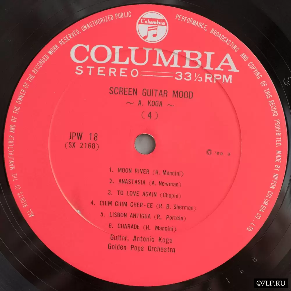 Перед нами роскошное японское издание — двойной альбом (2LP) «Screen Guitar Mood» (яп. 魅惑のスクリーン・ギター — Очаровательная экранная гитара), выпущенный компанией Nippon Columbia Co., Ltd. в сентябре 1969 года (на красных «яблоках» указан производственный код ’69. 9).