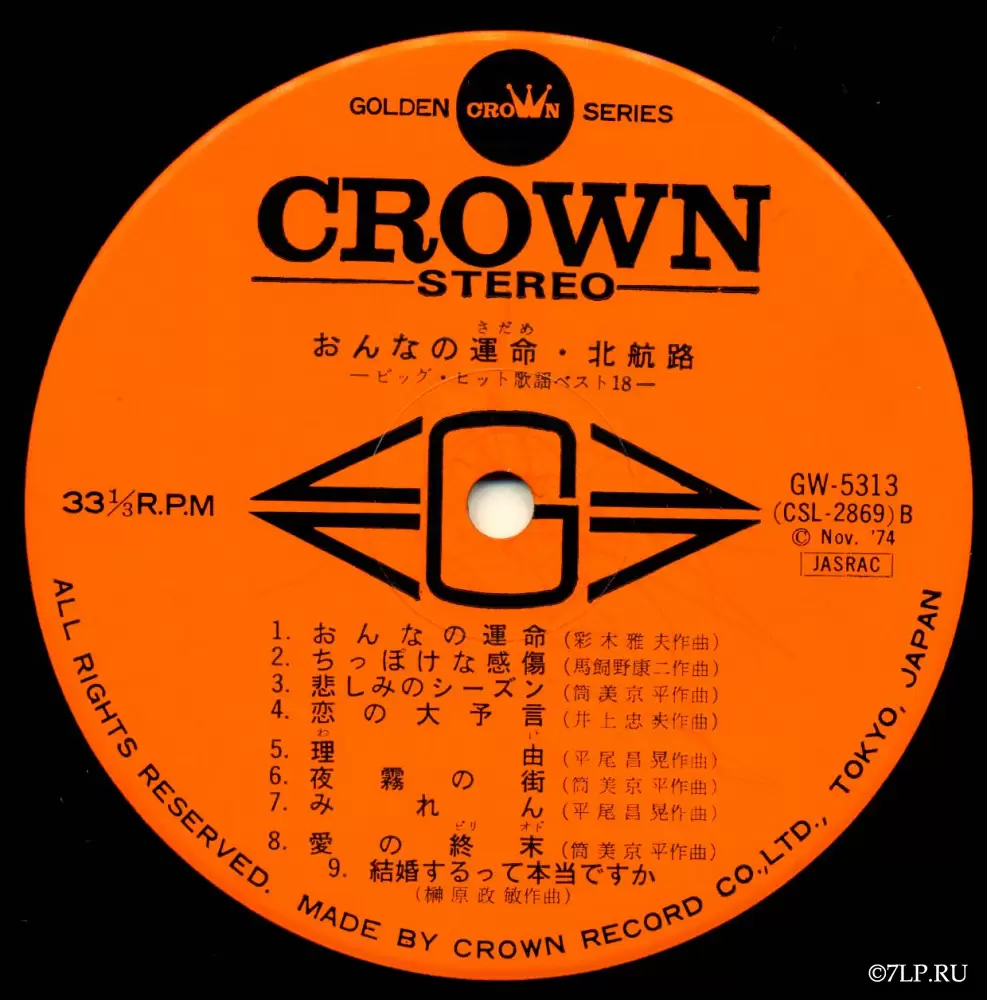 - Издатель и дата: Пластинка выпущена лейблом Nippon Crown в рамках серии Golden Crown Series. Каталожный номер: GW-5313. Копирайт на задней обложке и яблоках диска гласит «© Nov. '74», что указывает на релиз в ноябре 1974 года. Стоимость диска составляла 1,800 иен.