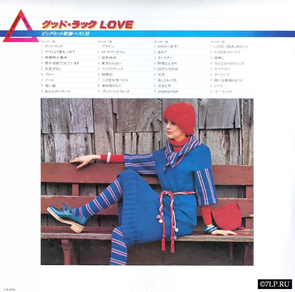 - Оформление (Cover Art): Обложка выдержана в духе западной моды конца 70-х. На ней изображена девушка европейской внешности в поразительном сине-красном вязаном наряде (платье, гетры, шарф и шапка) на фоне фактурной деревянной стены. Использование иностранных моделей было стандартом для таких пластинок: это придавало релизу интернациональный, модный лоск и дистанцировало его от традиционной японской эстрады.