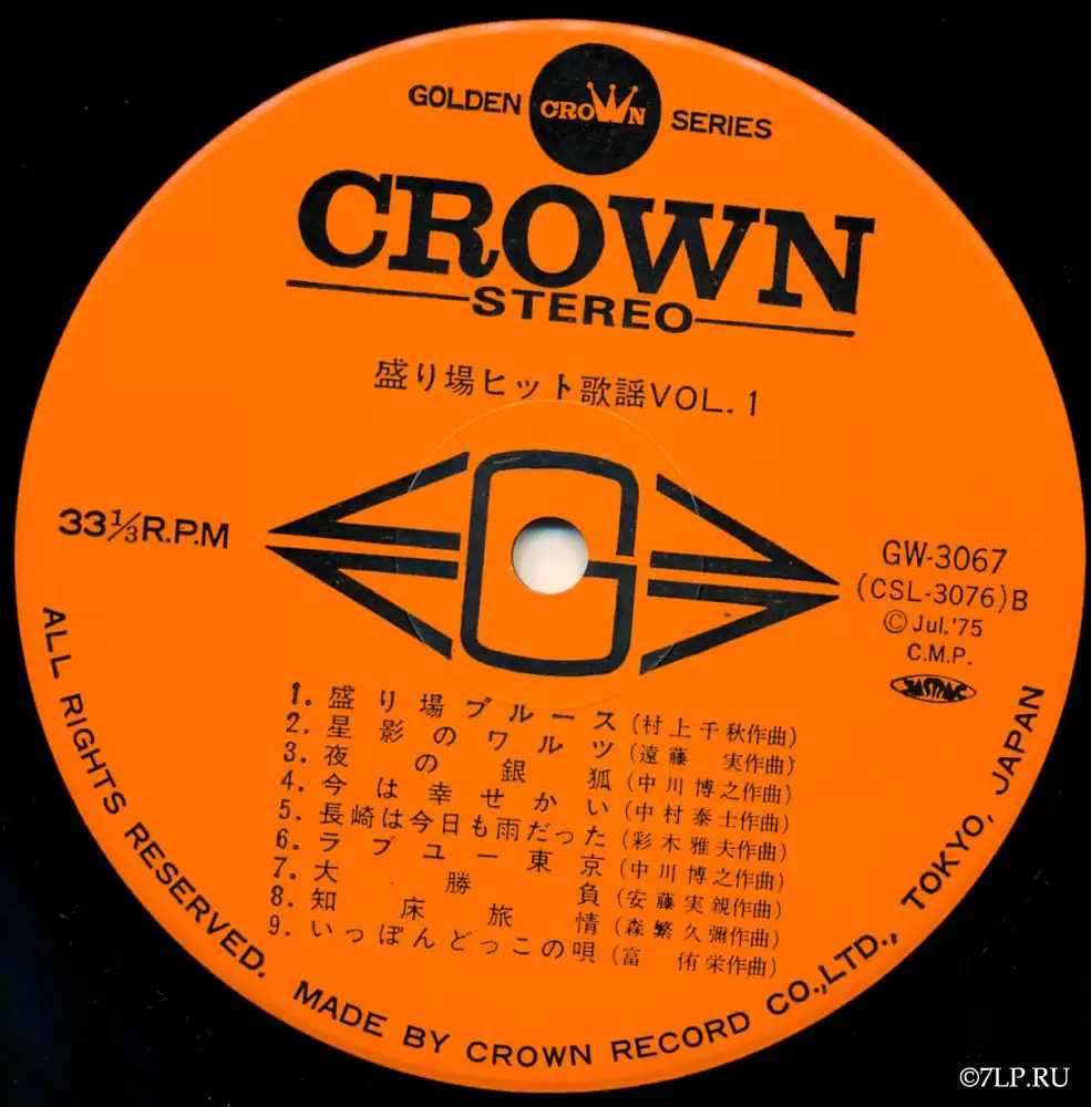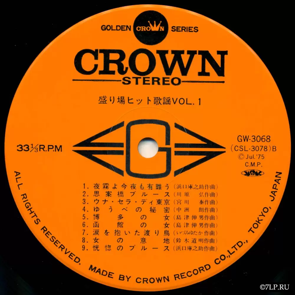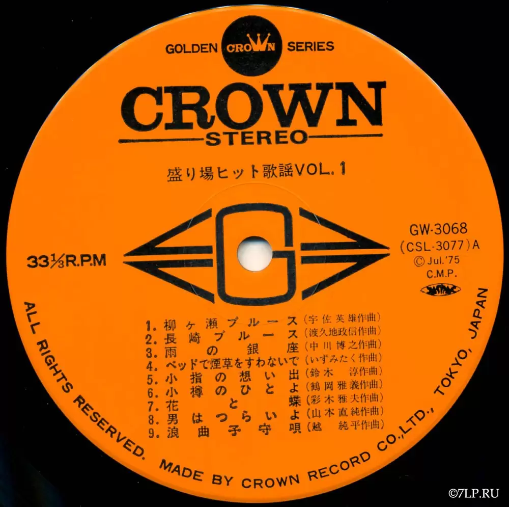 В отличие от поп-релизов, на яблоках этих пластинок указаны только имена композиторов (например, Комей Сонэ, Дзюн Судзуки и др.). Исполнителем же традиционно выступает безымянный студийный оркестр лейбла, скорее всего — Crown Orchestra (クラウン・オーケストラ) или аналогичный ансамбль. Музыкальное сопровождение таких релизов отличается густым, «ночным» звучанием: солирующий тенор-саксофон (имитирующий плачущий мужской вокал), труба, меланхоличная электрогитара и легкий свинг в ритм-секции. Это идеальный саундтрек для фильмов нуар или классического кино про якудза.