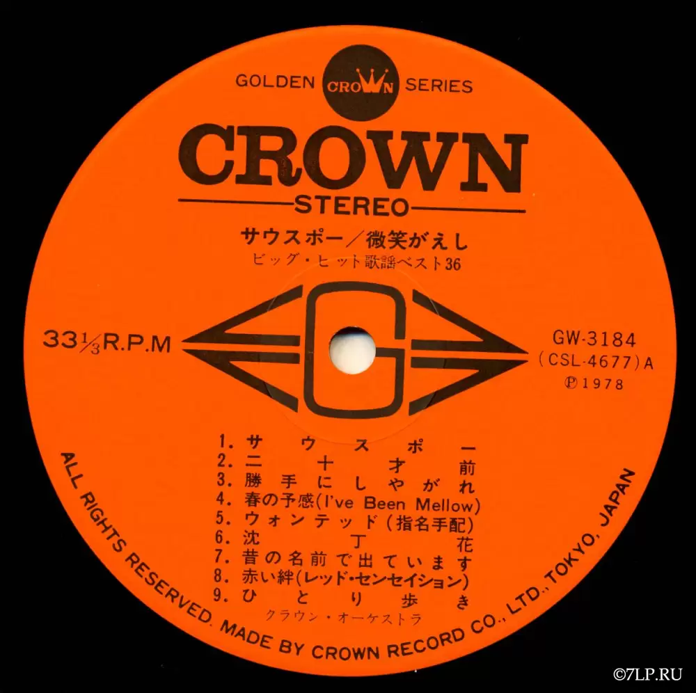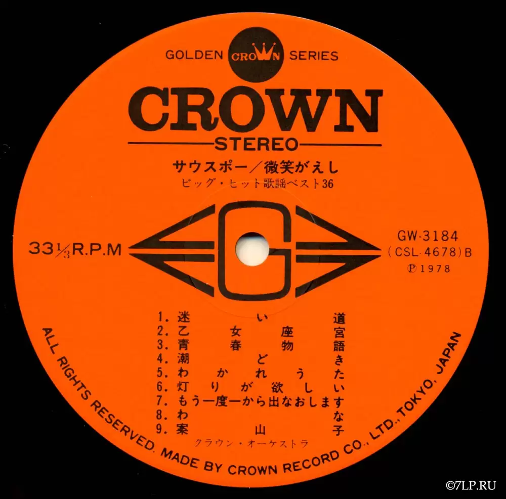 Перед нами двойной виниловый альбом «Big Hit Melodies Best 36» (яп. ビッグ・ヒット歌謡ベスト36), выпущенный японским лейблом Crown Record Co., Ltd. в 1978 году. Альбом вышел в рамках серии Golden Crown Series (каталожные номера GW-3183 и GW-3184).