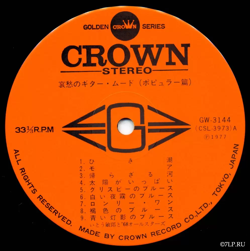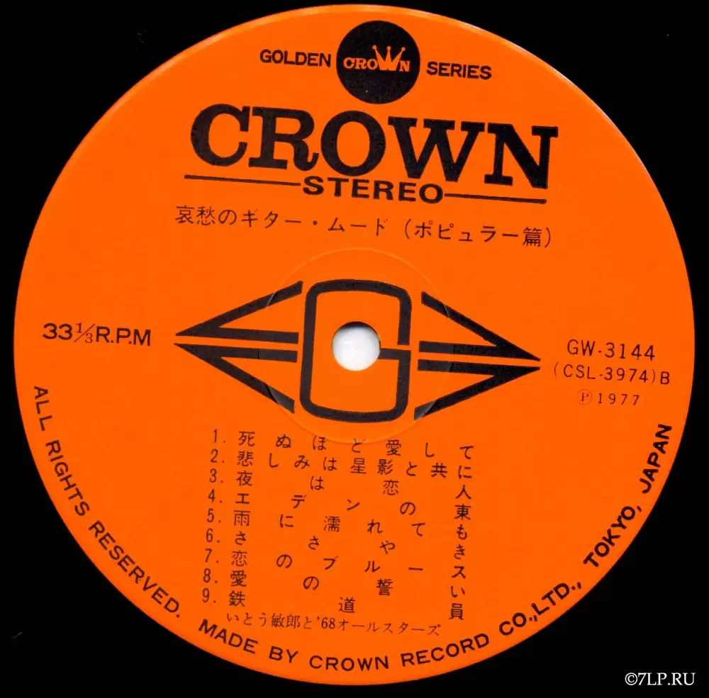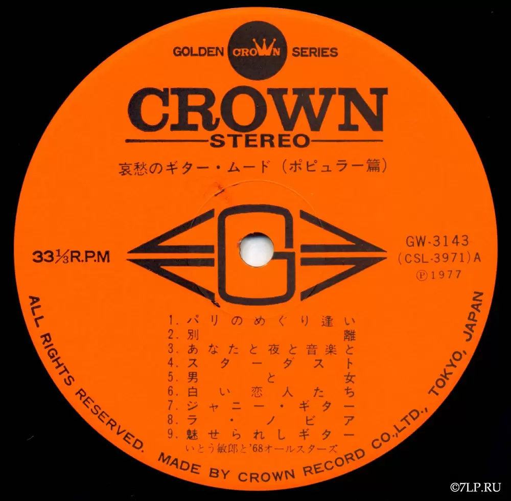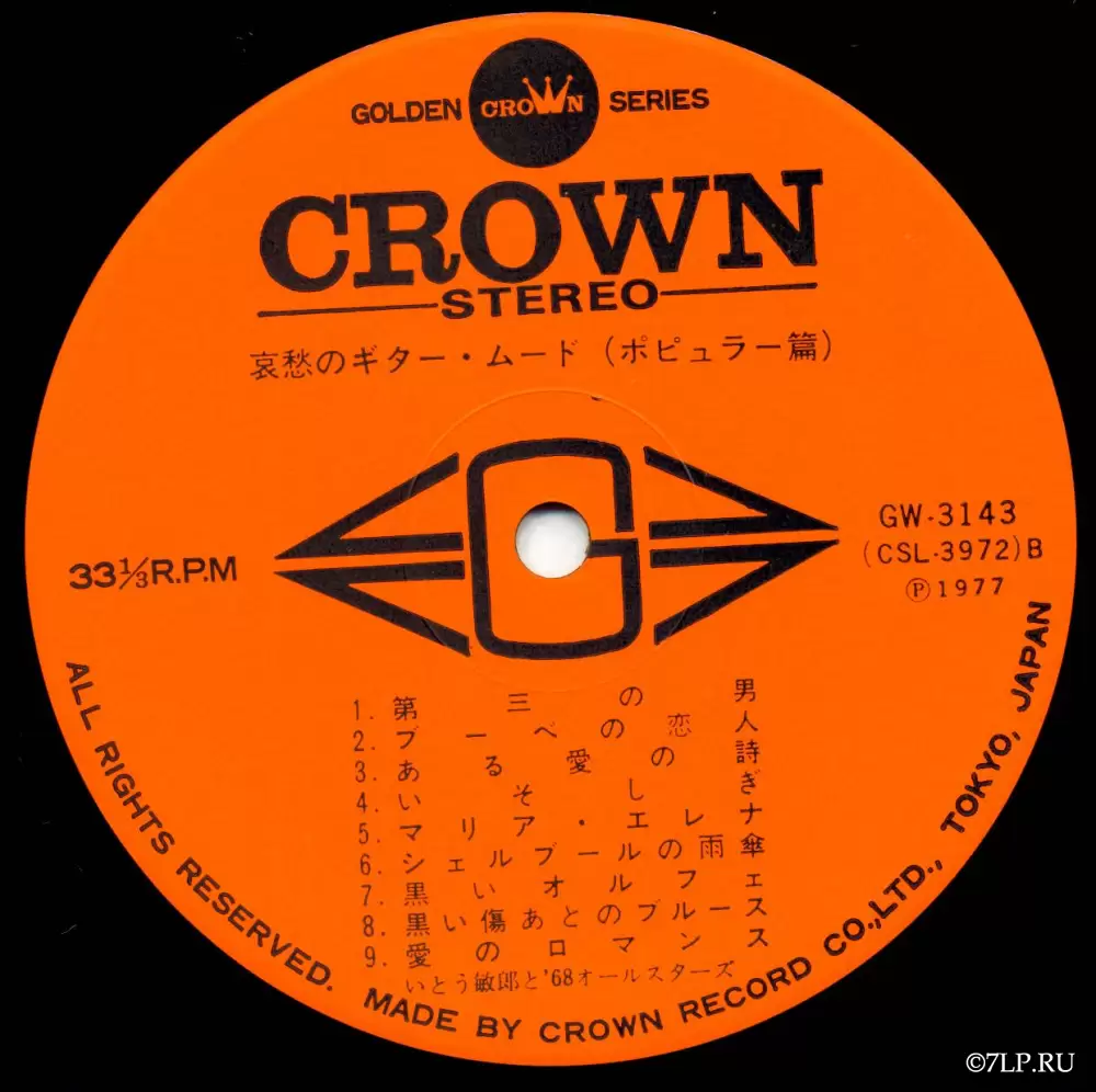 Перед нами двойной виниловый альбом «哀愁のギター・ムード・ベスト36 ポピュラー編» (Melancholy Guitar Mood Best 36 — Popular Edition), выпущенный японским лейблом Crown Record Co., Ltd. в 1977 году (каталожные номера GW-3143 и GW-3144). Альбом вышел в рамках знаменитой аудиофильской серии Golden Crown Series.