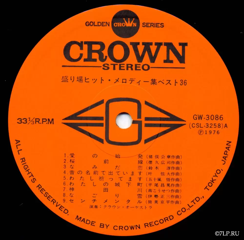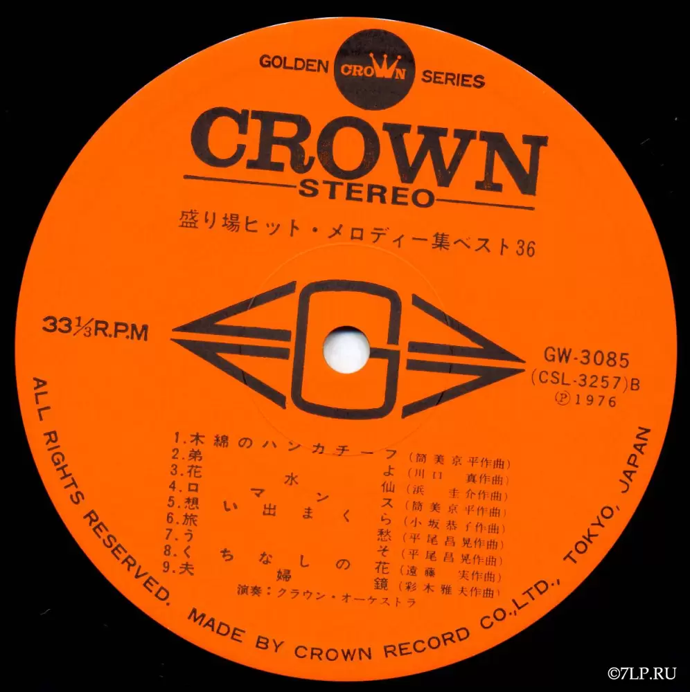 Перед нами двойной виниловый альбом «Sakariba Hit Melody Collection Best 36» (яп. 盛り場ヒット・メロディー集 ベスト36), выпущенный японским лейблом Crown Record Co., Ltd. в 1976 году (каталожные номера GW-3085 и GW-3086). Альбом издан в рамках знаменитой аудиофильской серии Golden Crown Series.