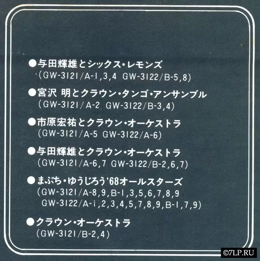 Фотография вкладыша (последний скриншот) является огромной редкостью и ценностью, так как раскрывает детальный состав исполнителей (на яблоках указаны лишь основные). Здесь играют легенды японского студийного джаза и эстрады: