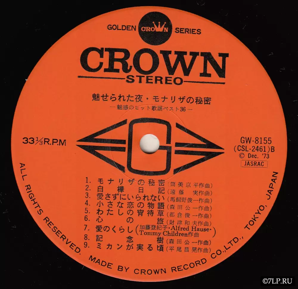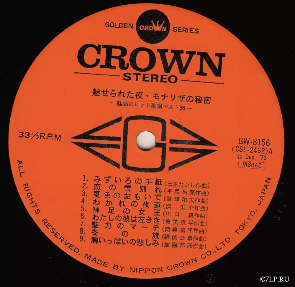 Перед нами двойной виниловый альбом «Miserareta Yoru / Mona Lisa no Himitsu — Miwaku no Hit Kayou Best 36» (яп. 魅せられた夜・モナリザの秘密 魅惑のヒット歌謡ベスト36), выпущенный японским лейблом Crown Record Co., Ltd. в декабре 1973 года (каталожные номера GW-8155 и GW-8156). Альбом издан в рамках престижной серии Golden Crown Series.