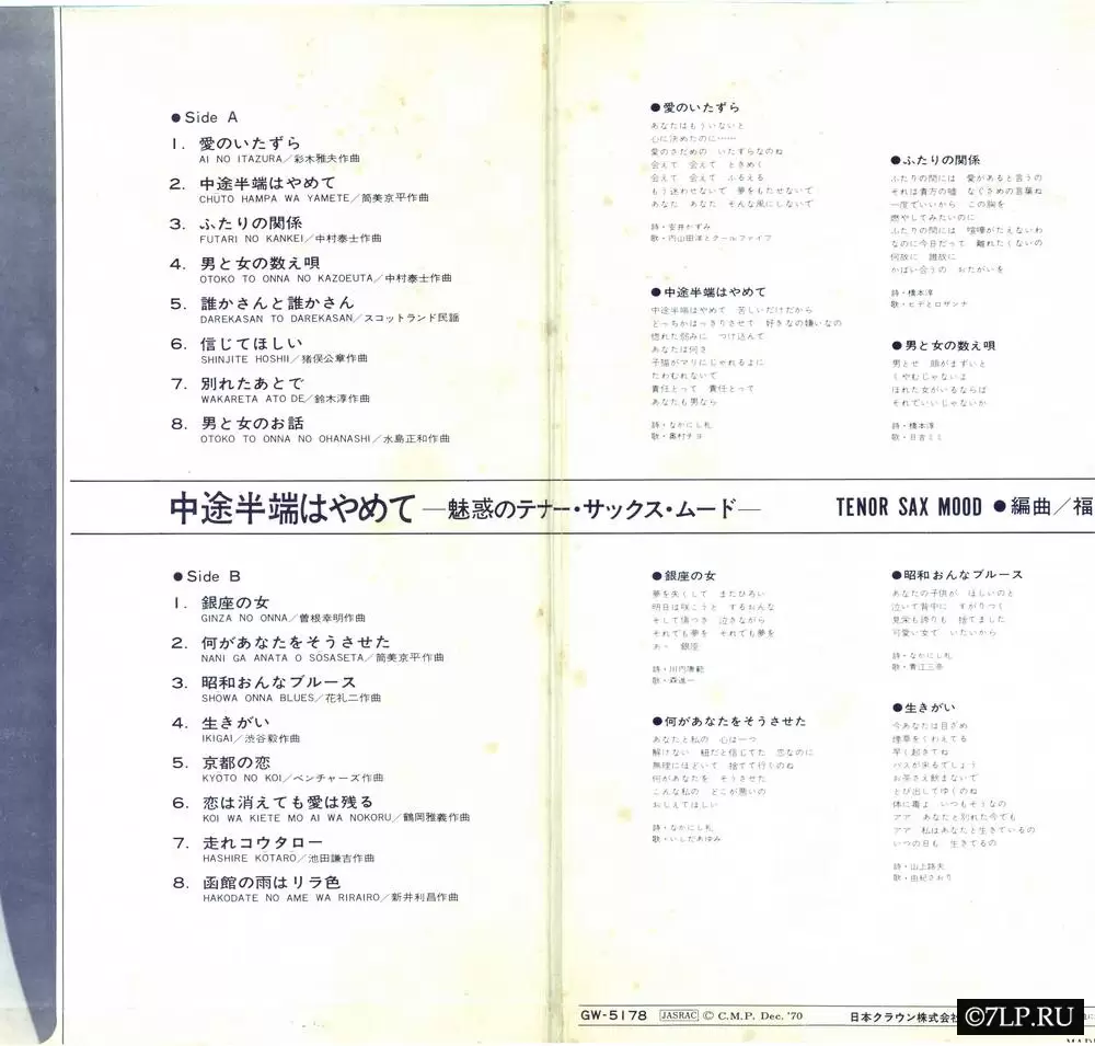 Альбом «Chuto Hampa Wa Yamete» (каталожный номер GW-5178) — это блестящий образец японской инструментальной музыки в жанре «Mood Music» (фоновая музыка для создания настроения). В 1970 году лейбл Nippon Crown выпустил этот сборник как компиляцию горячих эстрадных хитов того времени, переложенных для оркестра и солирующего саксофона.