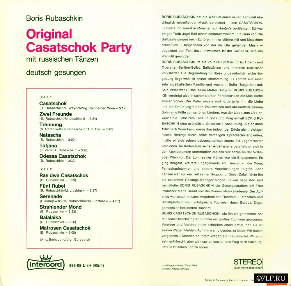 - Концепт издания: В конце 1960-х годов (примерно 1968–1969 гг.) в Европе вспыхнула мода на славянские и русские мотивы. Танец «Казачок» (Casatschok) стал абсолютным международным хитом, покорившим танцполы. Чтобы закрепить успех на немецкоязычном рынке, Рубашкин выпустил специальную версию своего танцевального альбома, где традиционные русские мелодии и его авторские песни были переведены на немецкий язык.