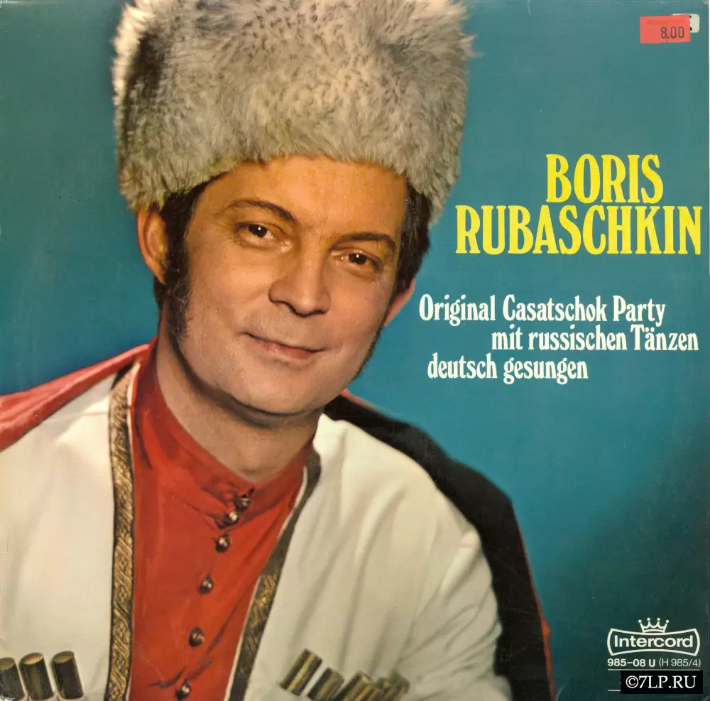 - Оформление: На лицевой обложке Борис Рубашкин предстает в классическом «лубочном» образе, который так любила европейская публика: в косоворотке, черной бурке и серой меховой папахе. На яблоках пластинки указано «Stereo, auch Mono abspielbar» (Стерео, также воспроизводится в моно).