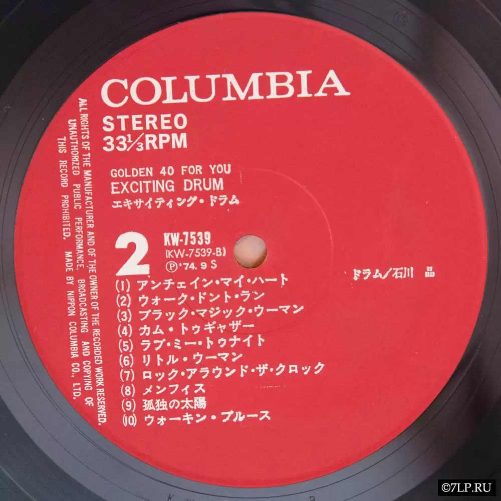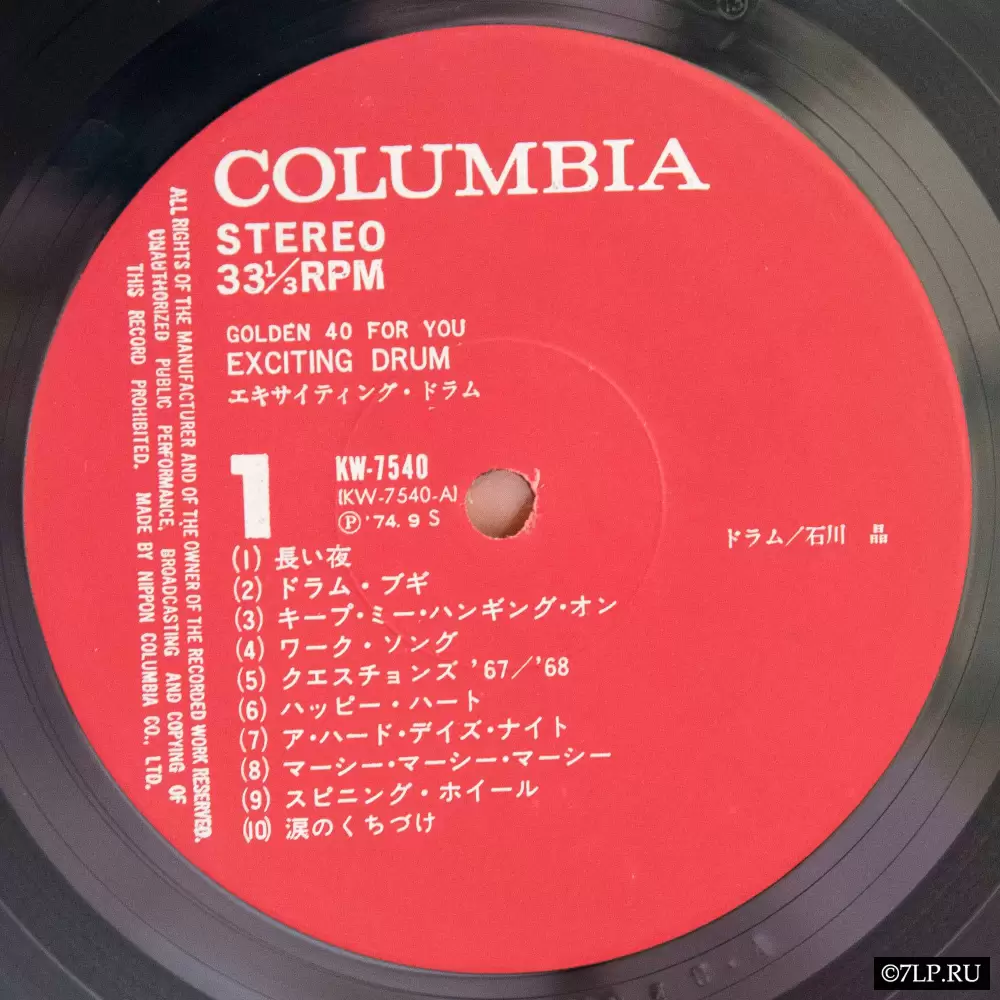 Перед нами двойной виниловый альбом-компиляция «Exciting Drum» (Эпичные барабаны), выпущенный в рамках серии лейбла Nippon Columbia «Golden 40 for you». Концепция серии заключалась во вмещении 40 популярных композиций на двух пластинках, где главным солирующим инструментом выступали барабаны.