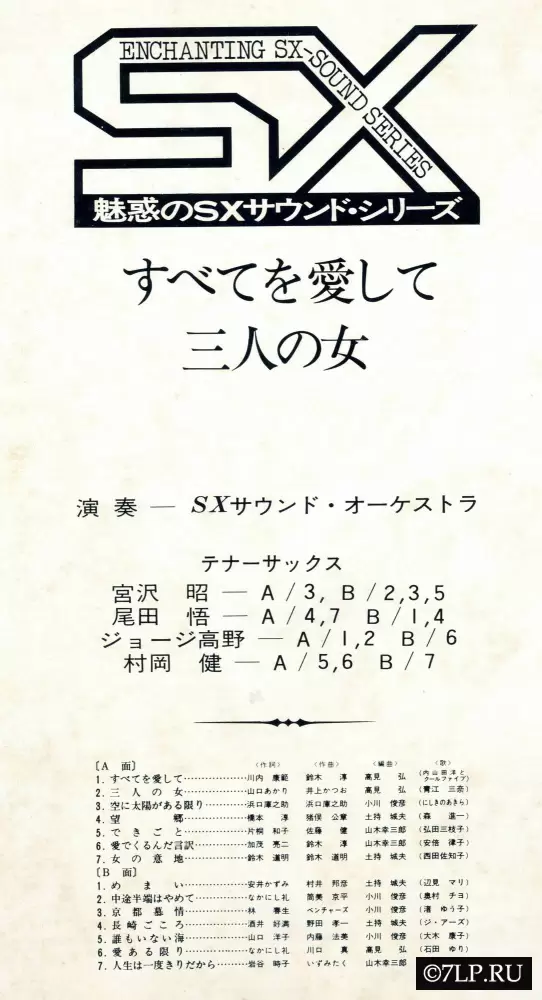 Вся музыка исполнена студийным коллективом SX Sound Orchestra (SXサウンド・オーケストラ). Уникальность этого релиза заключается в том, что солирующие партии на тенор-саксофоне были поручены сразу четырем легендарным японским джазменам. На вкладыше (последний скриншот) есть точная разбивка, кто в каком треке солирует: