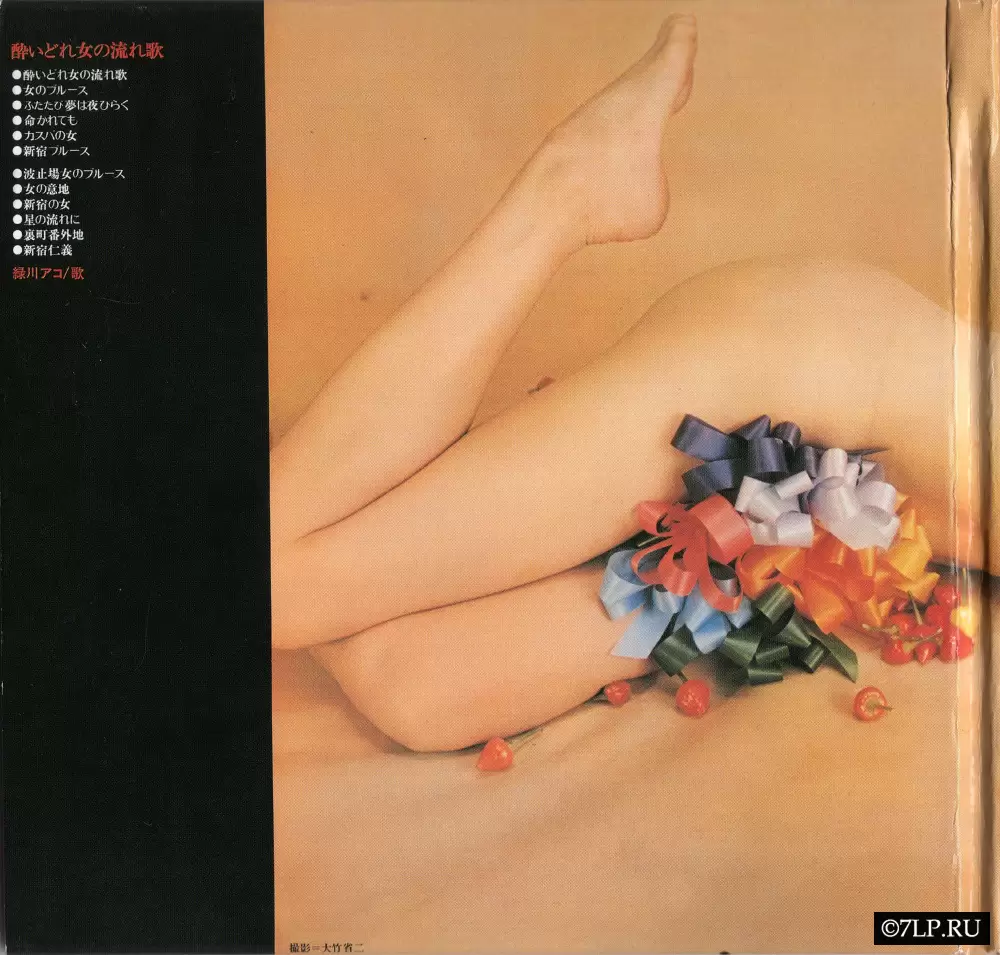 - Обложка (Nude Jacket): Одной из главных причин легендарного статуса этого альбома является его обложка. На ней изображена обнаженная девушка, стратегически прикрытая разноцветными подарочными бантами, вокруг которой рассыпан острый красный перец. Для консервативной японской эстрады 1970 года это был невероятно смелый и скандальный шаг. На OBI-ленте (оранжевая полоса слева) маркетологи специально делают акцент на этой обложке («Нудо дзякэтто»), привлекая коллекционеров.