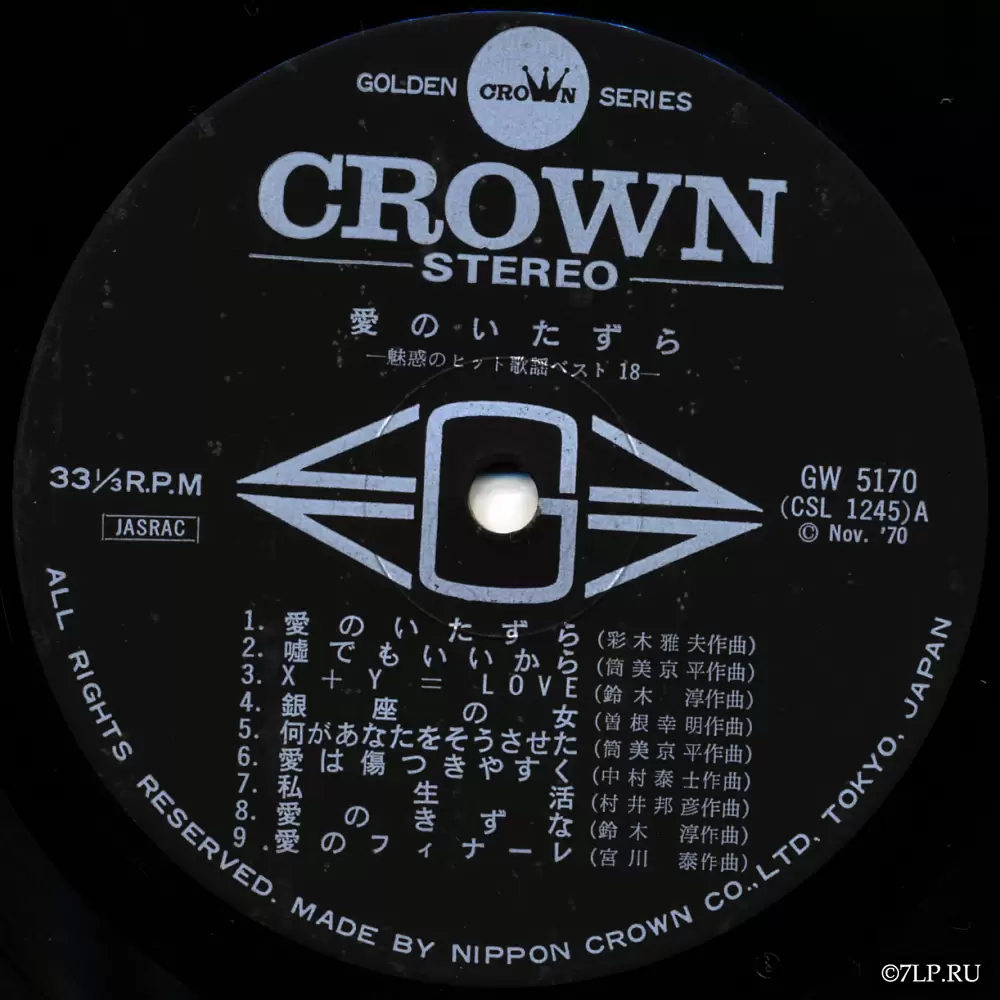 Перед нами классический образец японской музыкальной индустрии начала 1970-х годов — виниловая пластинка, выпущенная лейблом Crown Records.
