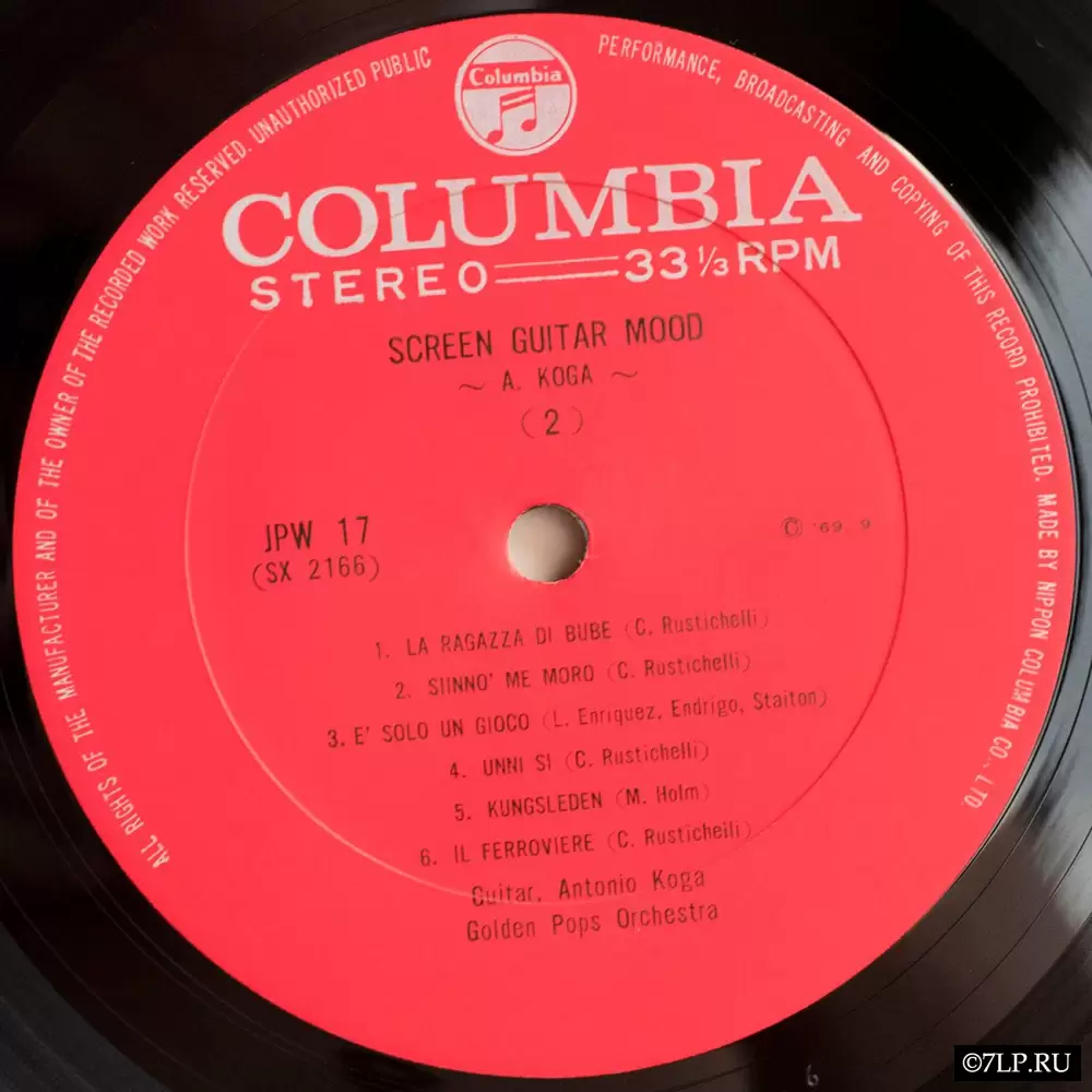 Перед нами роскошное японское издание — двойной альбом (2LP) «Screen Guitar Mood» (яп. 魅惑のスクリーン・ギター — Очаровательная экранная гитара), выпущенный компанией Nippon Columbia Co., Ltd. в сентябре 1969 года (на красных «яблоках» указан производственный код ’69. 9).