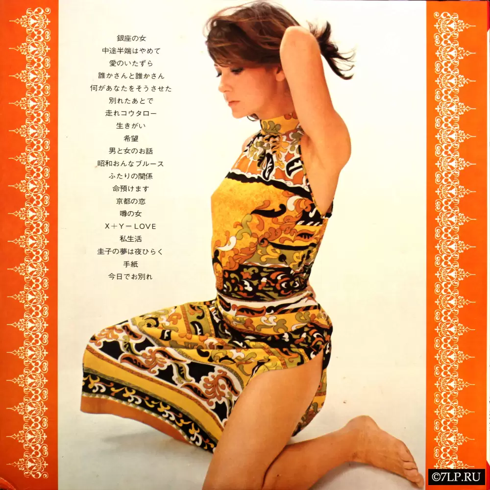 - На задней стороне конверта (где расположен трек-лист) мы видим уже другую модель — шатенку в ярком летнем платье без рукавов с глубоким разрезом и характерным для 70-х годов психоделическим узором. Использование откровенных фотографий западных моделей было главным маркетинговым ходом японских лейблов для продажи альбомов с фоновой инструментальной музыкой. Это привлекало внимание покупателей-мужчин в музыкальных магазинах.